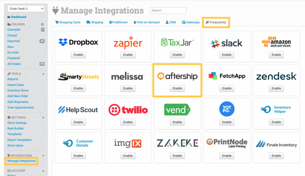 To enable the integration, click on Manage Integrations in the left sidebar. Under the Productivity tab, find and enable the AfterShip integration.