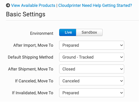 Select Live to begin pulling orders for processing or Sandbox to operate in a staging environment.