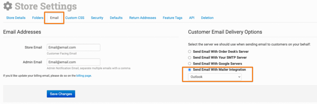 Once you’ve enabled the Outlook integration, you’ll be able to select it as your preferred method for sending emails by navigating to your Store Settings, selecting Send Email With Mailer Integration, and choosing Outlook from the dropdown.