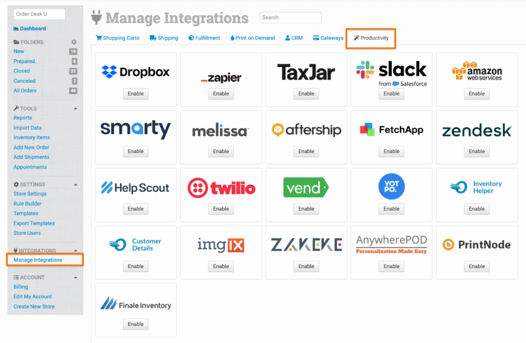 To enable Slack in your Order Desk store, click on Manage Integrations in the left sidebar. Under the Productivity tab, find and enable Slack.
