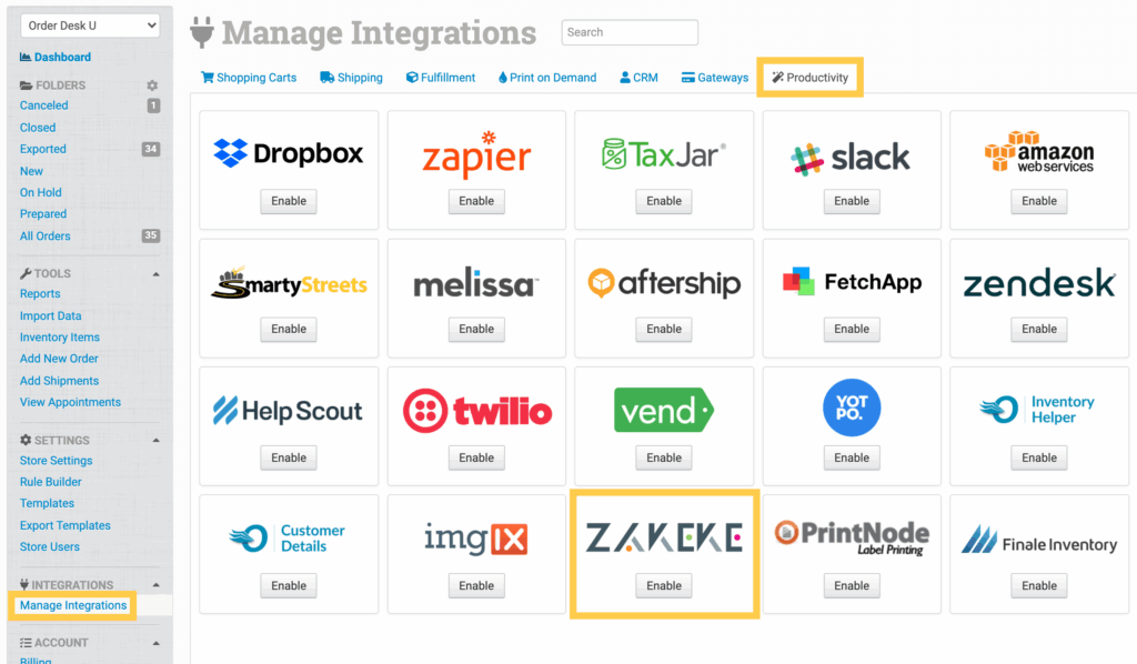 To enable the integration, click on  Manage Integrations in the left sidebar. Under the Productivity tab, find and enable the Zakeke integration.