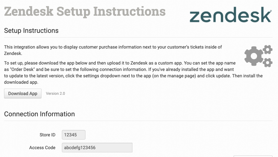 The Zendesk setup instructions will have you download the Order Desk app and upload it into Zendesk to secure the connection between the two applications.