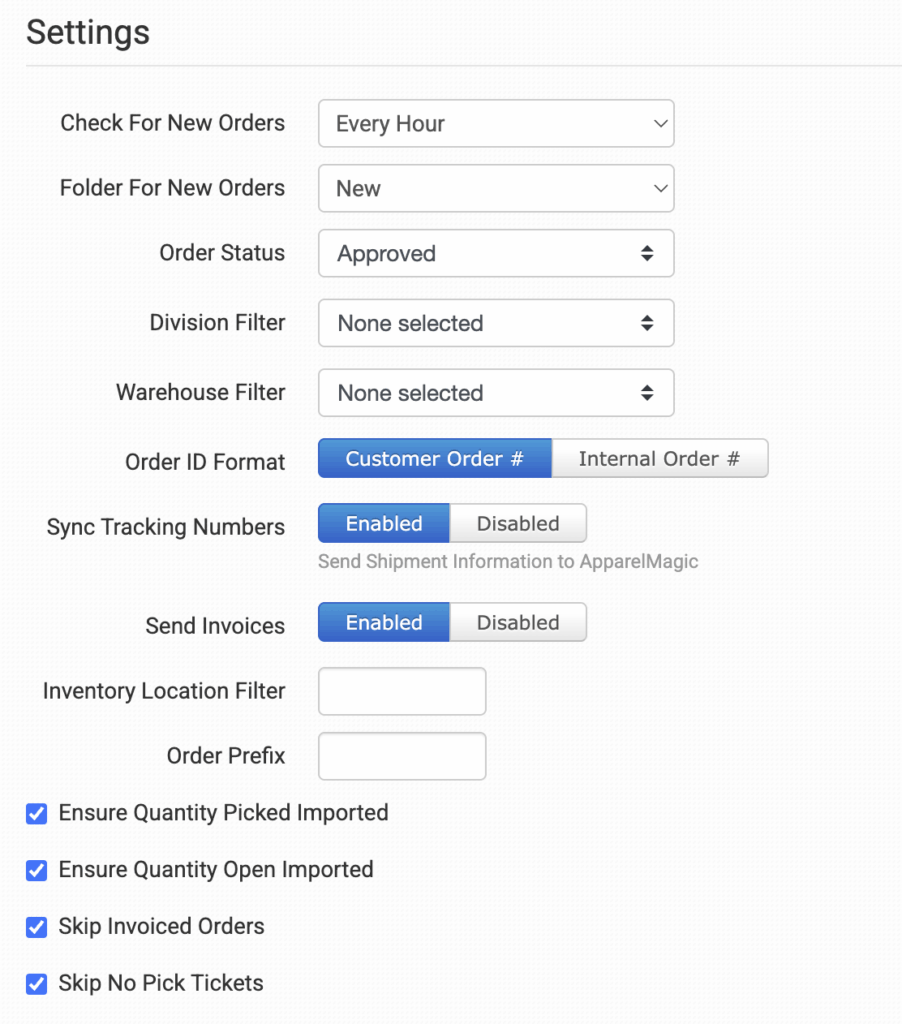 Once enabled, set your preferences in the ApparelMagic integration.