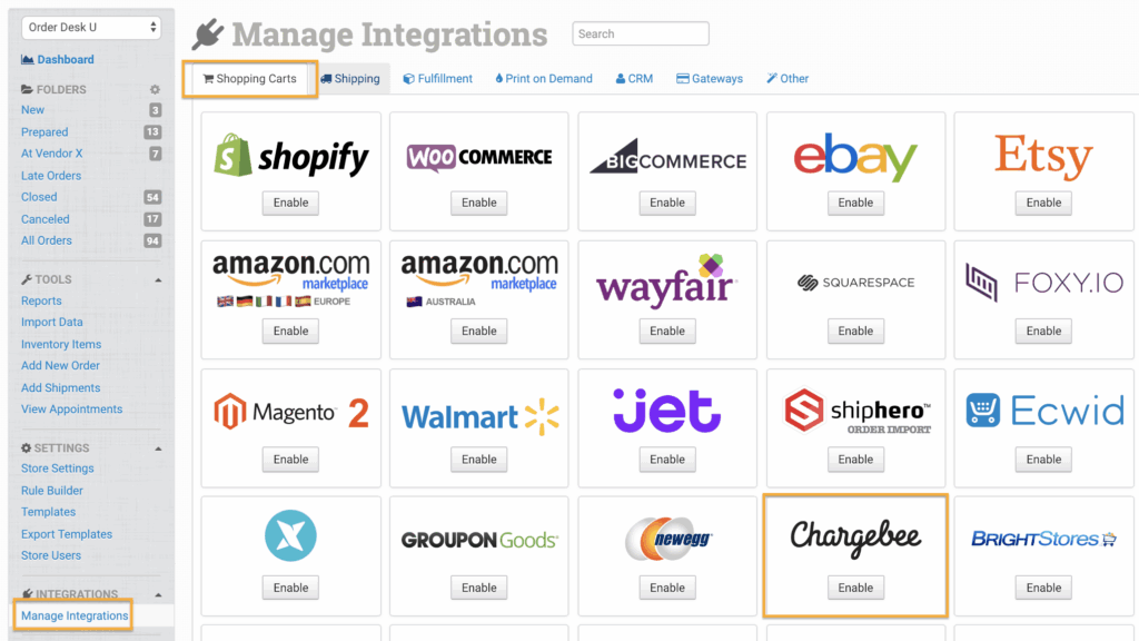 To connect to the Chargebee integration, click on Manage Integrations under the Integrations menu in the left sidebar. Under the Shopping Carts tab, find and enable Chargebee.
