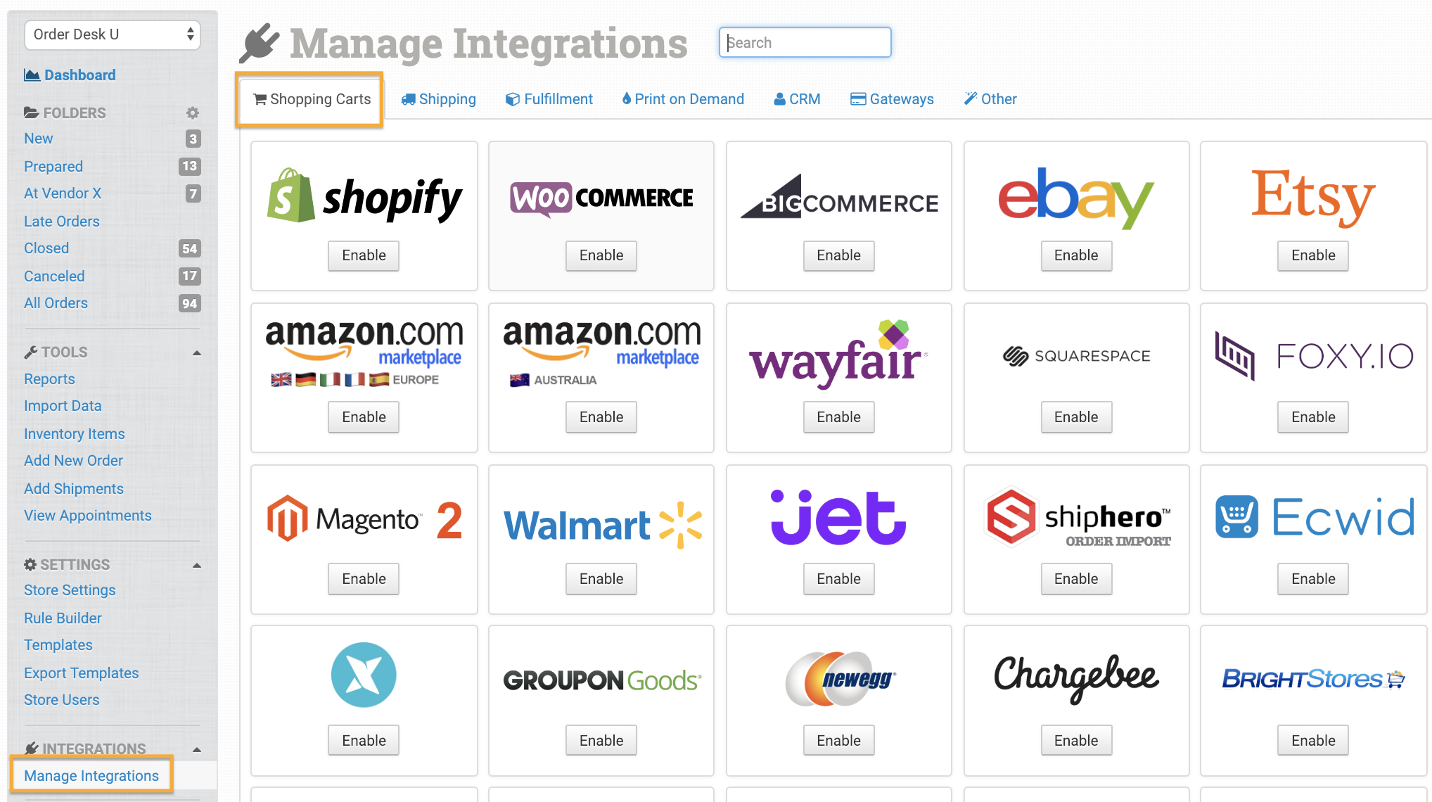 In Order Desk, click on Manage Integrations under the Integrations menu in the left sidebar. Under the Shopping Carts tab, find and enable CommerceHub.