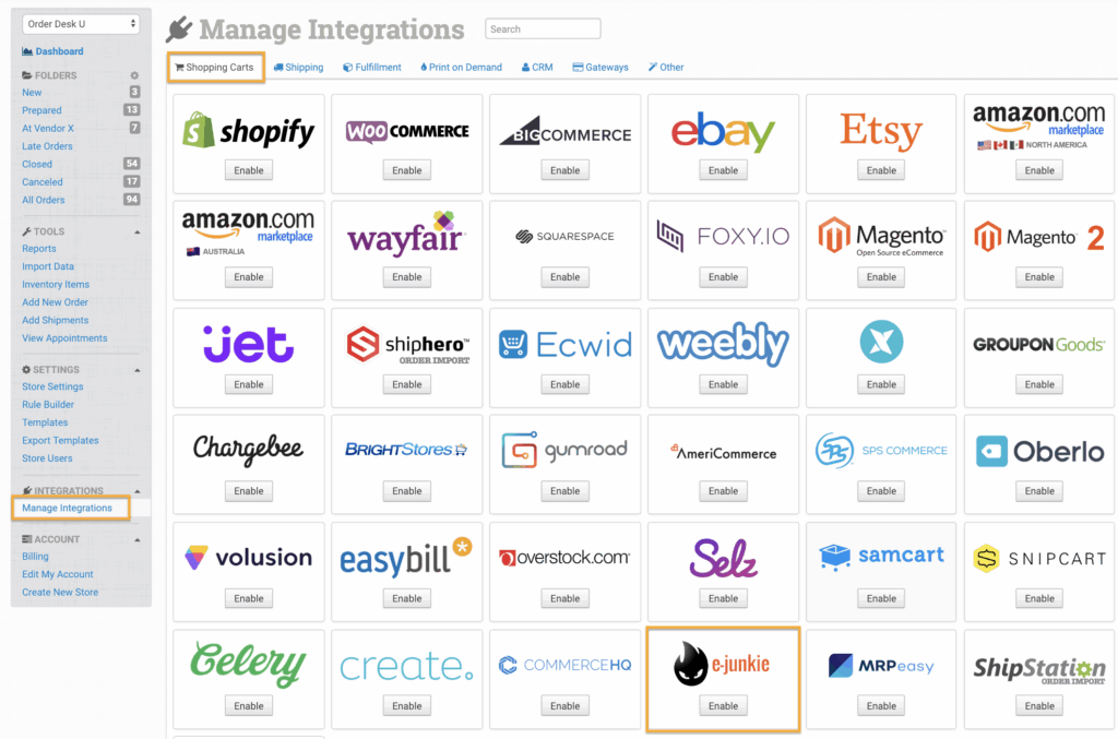 In Order Desk, click on Manage Integrations under the Integrations menu in the left sidebar. Under the Shopping Carts tab, find and enable E-junkie.