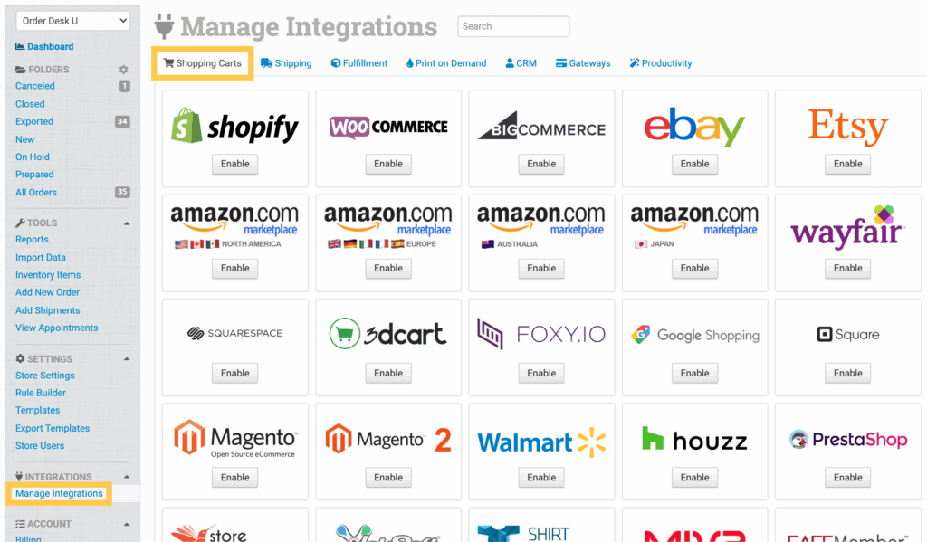 To connect to Ecwid by Lightspeed, click on the Manage Integrations link in the left sidebar and under the Shopping Cart tab find and enable the Ecwid by Lightspeed integration.