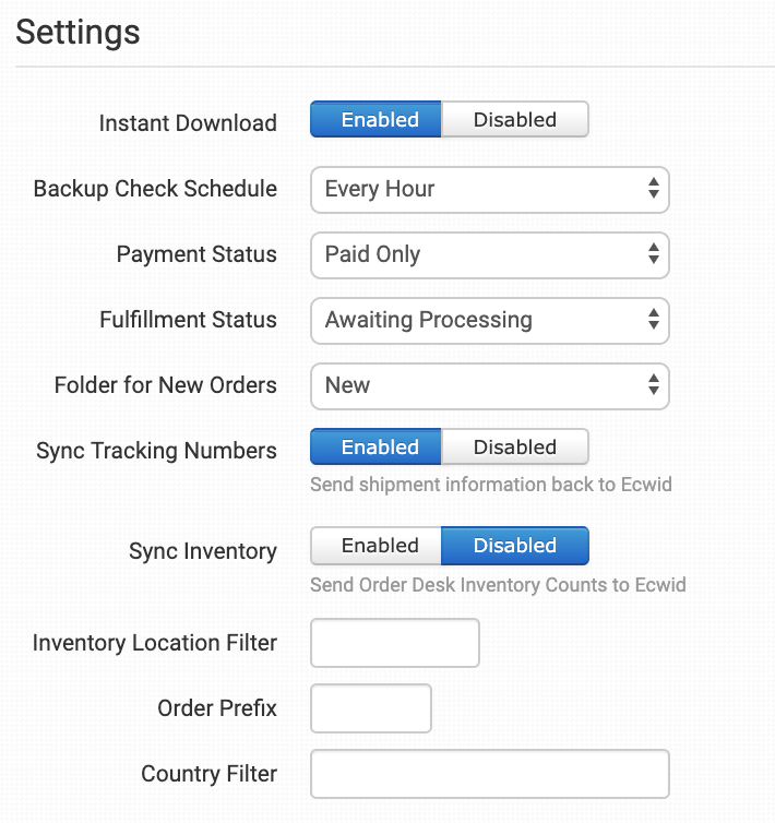 If disabled, tracking and fulfillment details will not be sent back to Ecwid by Lightspeed. If you prefer, you can send a shipment notification email from Order Desk to your customers, but your orders in Ecwid by Lightspeed will need to be closed another way.
