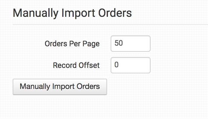 Ecwid has a limit that only allows 100 orders per page to be manually pulled. If you need to import a large number of orders, you can set the Orders Per Page to 100, then set your Record Offset to 100 and click on the Manually Import Orders button. After pulling in the orders, if you have more that need to be imported, change the Record Offset to 200, then 300, etc., until all of your orders have been imported.