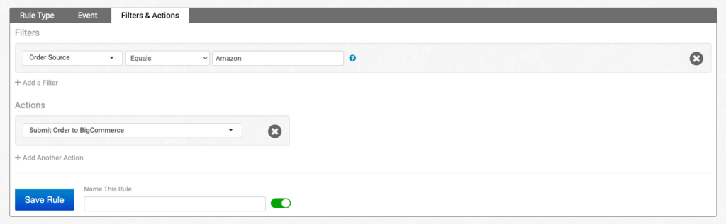 Next set the filters that will tell Order Desk which orders should go to BigCommerce (for example, all Amazon orders), and select the Submit Order to BigCommerce action: