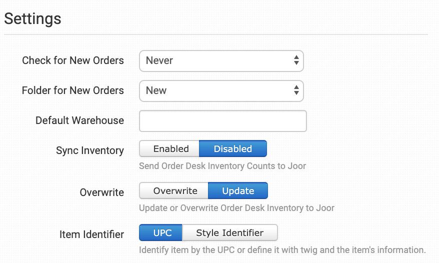 If Sync Inventory is enabled, Order Desk needs to know which item identifier to use when communicating with Joor about your inventory stock counts.