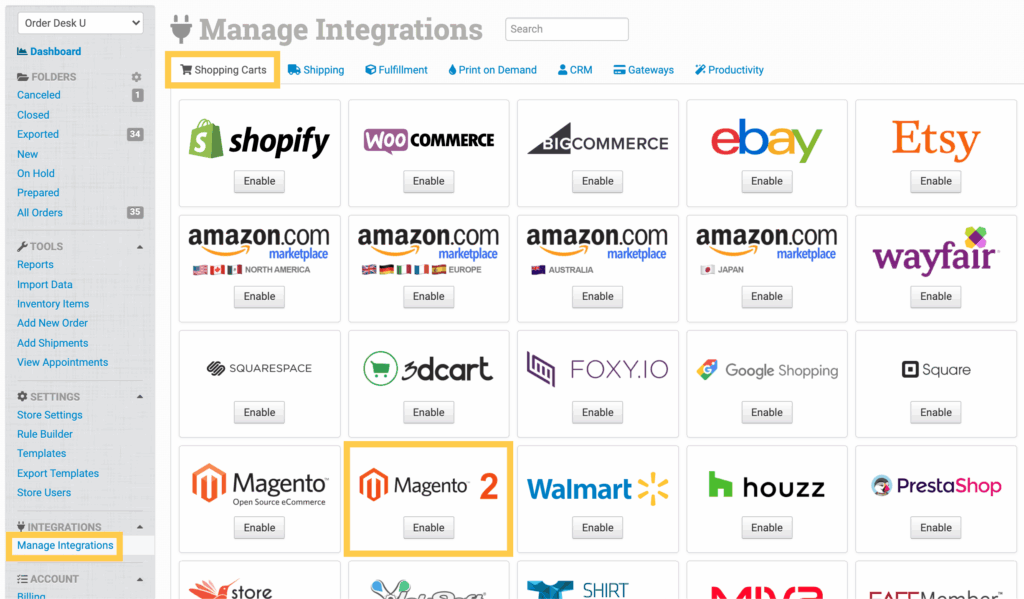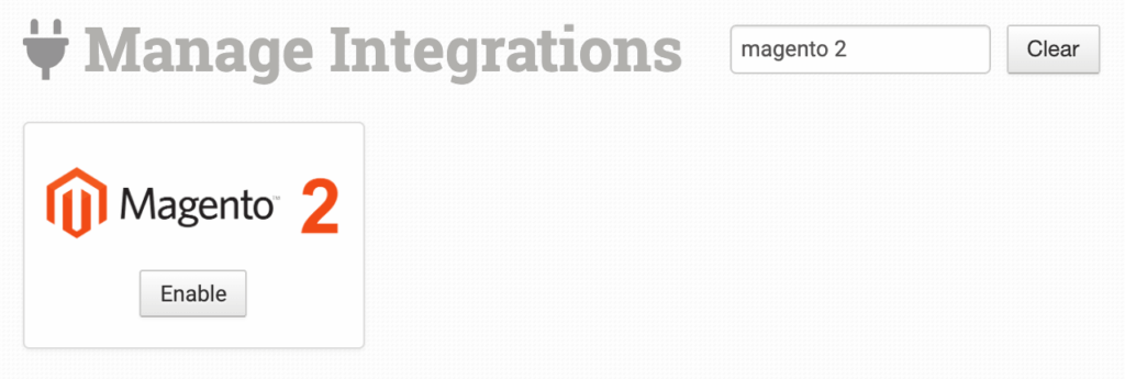 To connect to Magento 2, click on Manage Integrations under the Integrations menu in the left sidebar. Under the Shopping Carts tab, find and enable Magento 2.