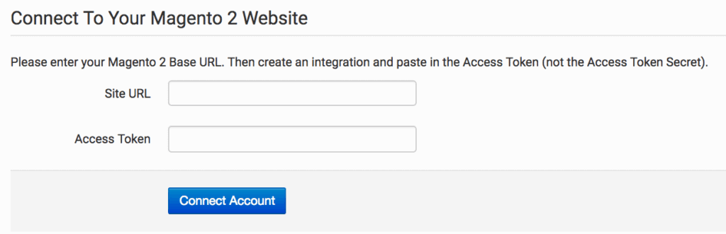 To complete the connection, you will need to get an Integration Access Token from Magento.