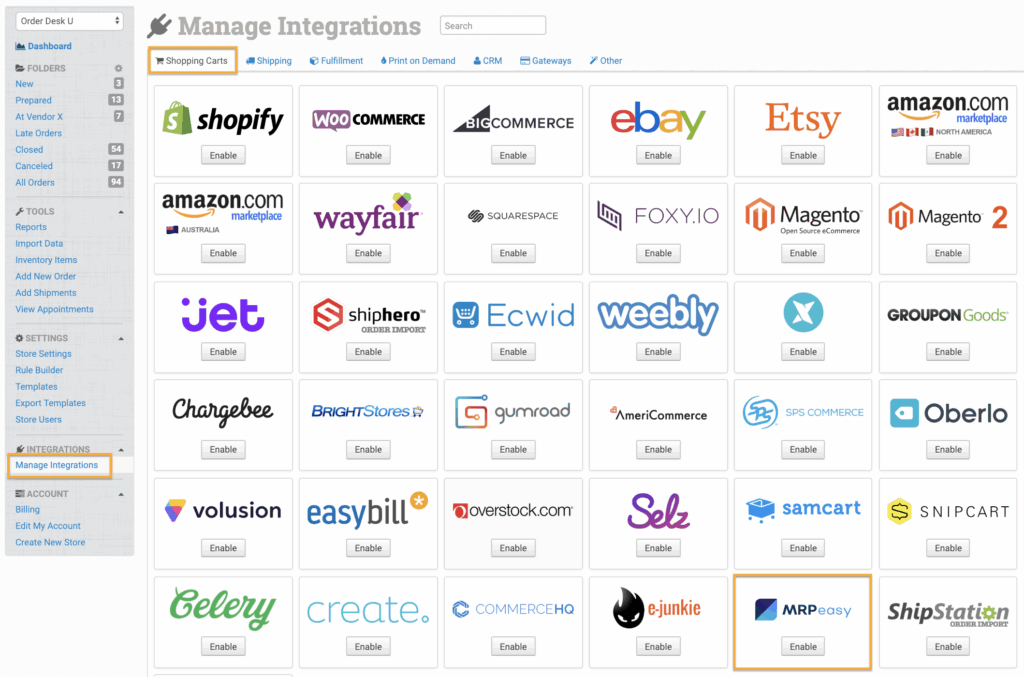 In Order Desk, click on Manage Integrations under the Integrations menu in the left sidebar. Under the Shopping Carts tab, find and enable MRPeasy.