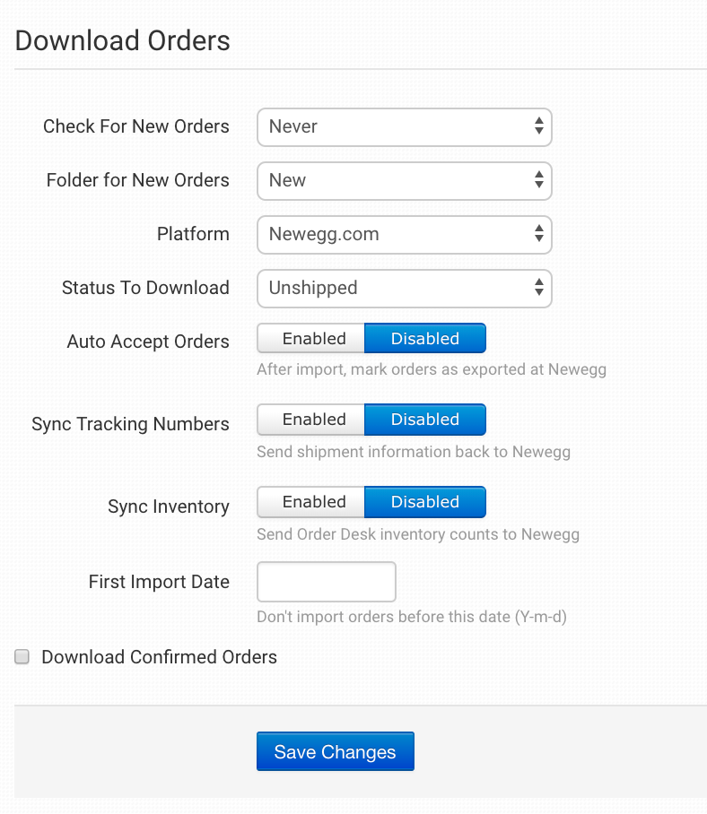If you want Order Desk to sync your inventory availability back to Newegg, enable the Sync Inventory setting. As inventory counts are updated here, Order Desk will send those numbers to Newegg to update your product availability there.