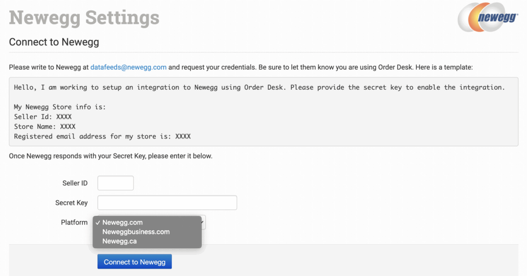 Once enabled, contact Newegg to get your Seller ID and Secret Key with the sample email template. Choose which platform you’ll be using; either Newegg.com, Neweggbusiness.com, or Newegg.ca, then connect to Newegg.