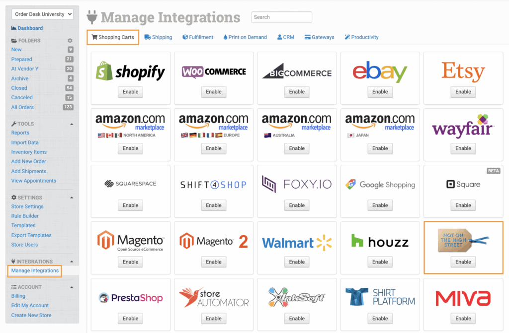 To connect to Notonthehighstreet, click on the Manage Integrations link in the left sidebar and under the Shopping Cart tab find and enable the Notonthehighstreet integration.