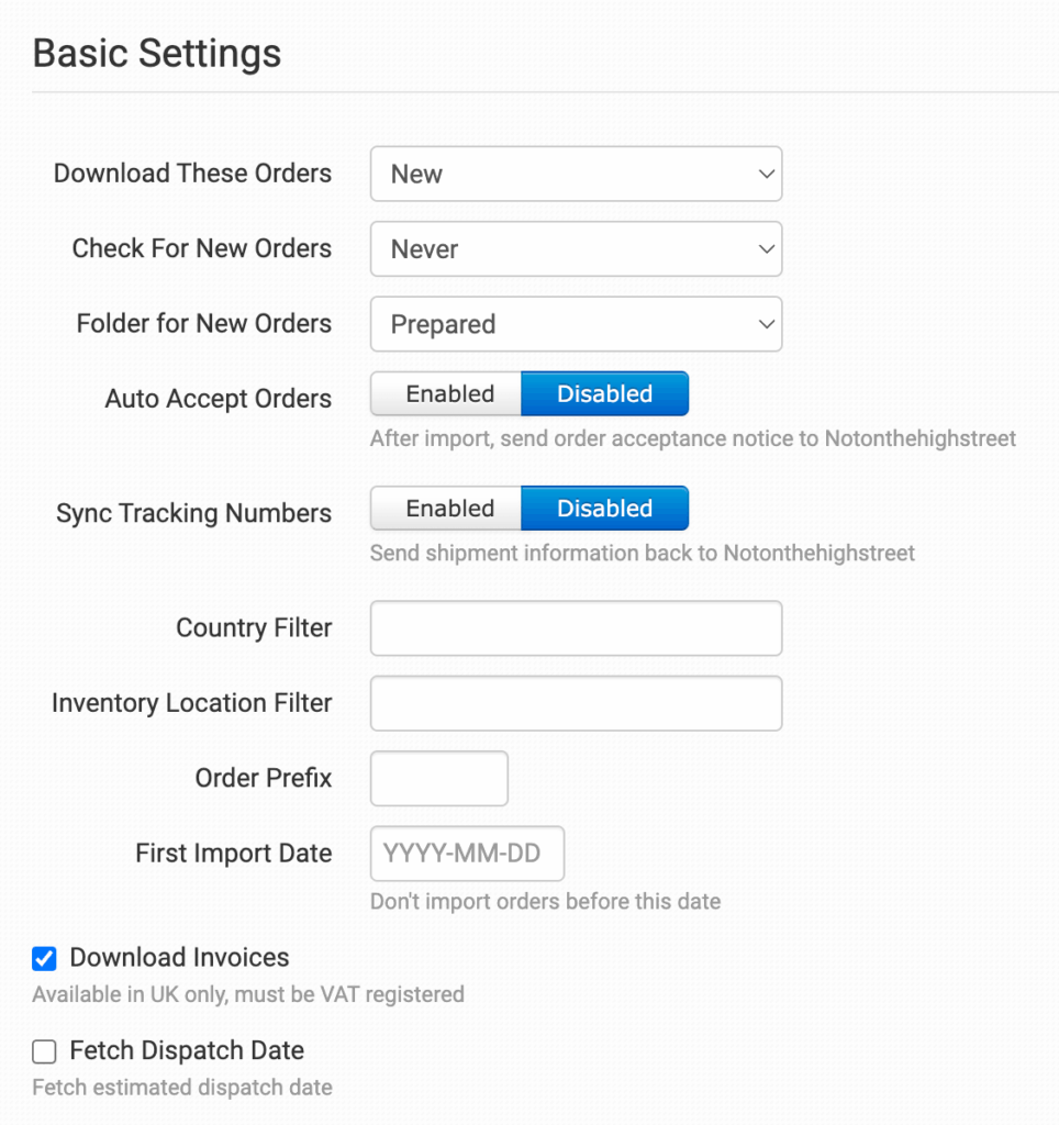 The inventory location name must match exactly as it is on your inventory items in Order Desk. When importing new orders from Notonthehighstreet, Order Desk will look at the SKUs on the items and compare to the SKUs in your inventory here. Any orders with items for a location that isn’t listed in this field will not be imported.