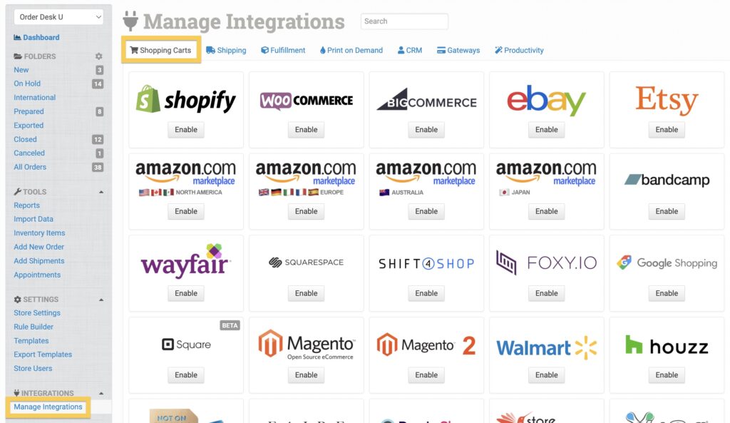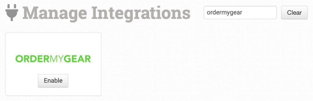 In Order Desk, click on Manage Integrations under the Integrations menu in the left sidebar. Under the Shopping Carts tab, find and enable OrderMyGear.
