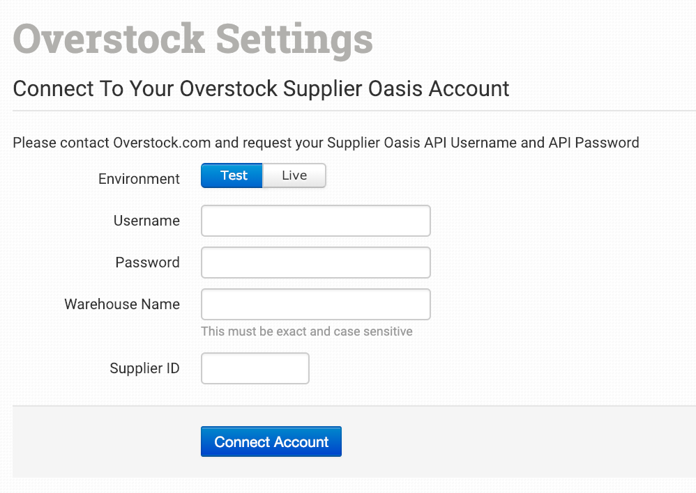 If you haven’t already, contact Overstock.com to request your Supplier Oasis API username and API password.