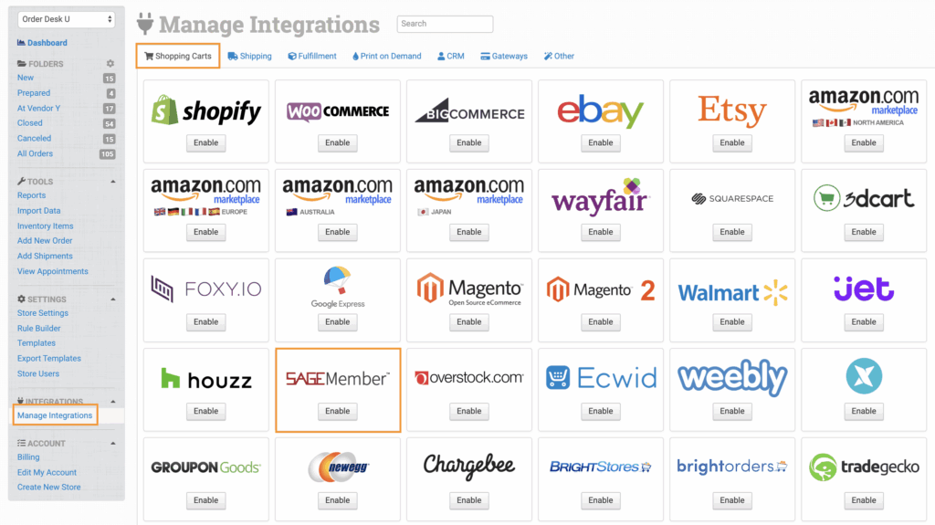 To begin, click on Manage Integrations from the left sidebar in Order Desk. Under the Shopping Carts tab, find and enable SAGEMember.