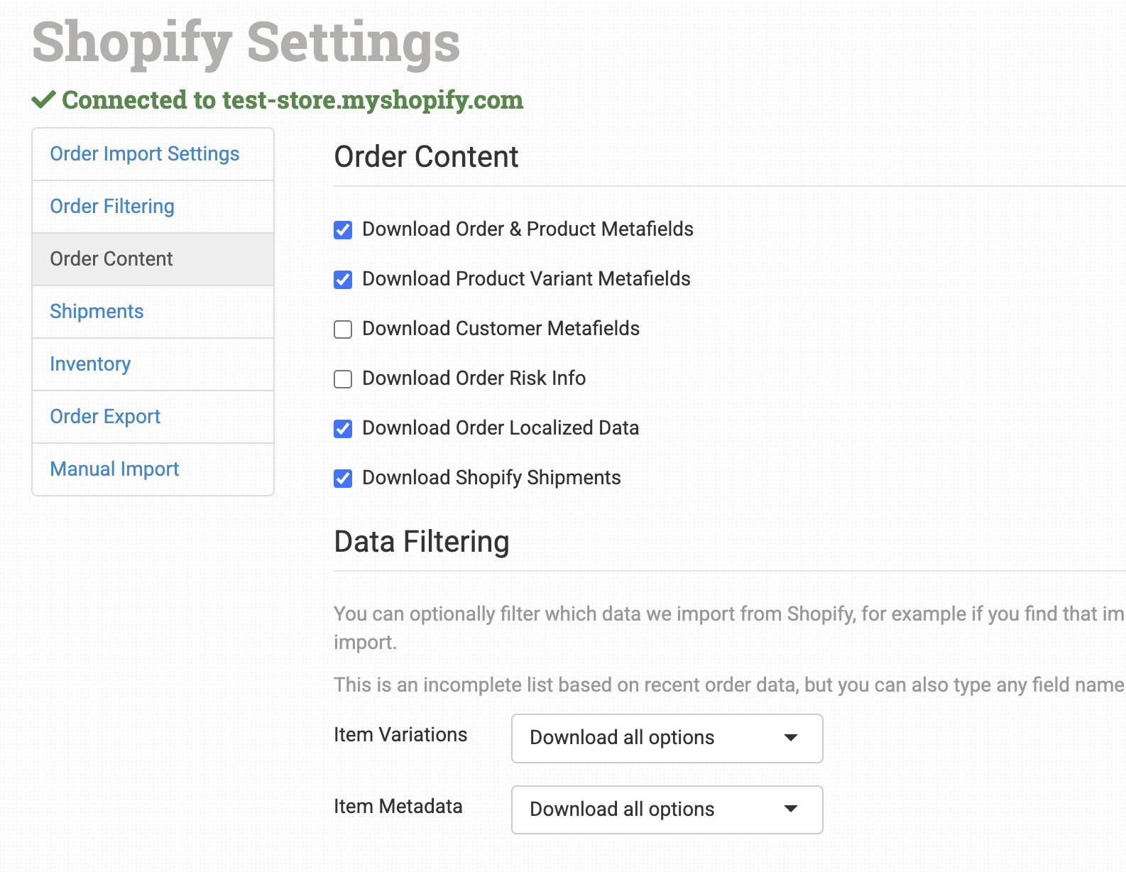 Please keep in mind that downloading these metafields can increase the amount of data being sent through the API. This can prevent some orders with more fields from being downloaded if they exceed Shopify’s rate limits.