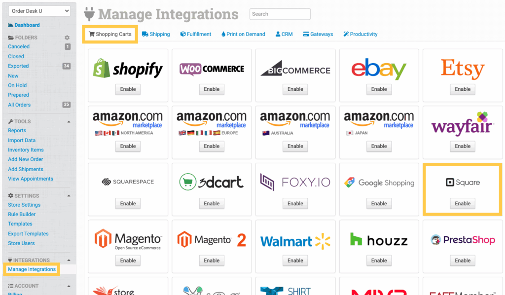 To begin, click on Manage Integrations from the left sidebar in Order Desk. Under the Shopping Carts tab, find and click to enable Square.