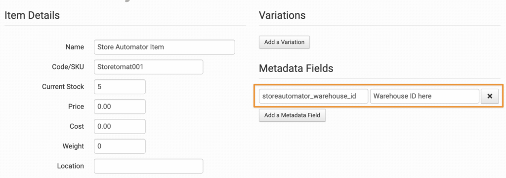 Head to your Inventory Items page and find the item you need. Within that item page, add a metadata field called storeautomator_warehouse_id and set the value to your preferred warehouse ID.