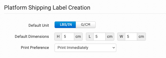 If Platform Shipping is selected under the Shipping Type integration setting, this tool will appear to allow for the use of label creation settings.