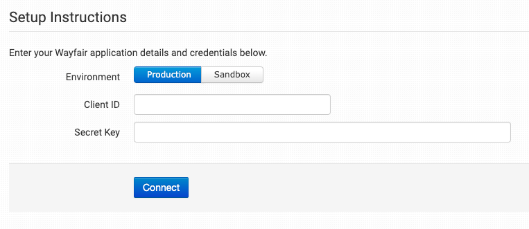 Next, paste your Client ID and Secret Key from Wayfair Castlegate and click to connect.