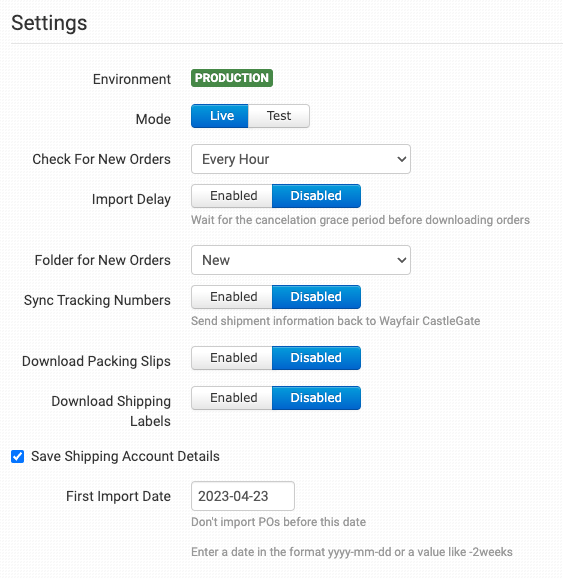 Once enabled, choose from either a Production or Sandbox environment. Be sure to choose the same application environment that is set up in your Wayfair Castlegate account, as accounts used for testing can sometimes be set up in production environments. If you’re unsure, talk to your Wayfair Castlegate rep.