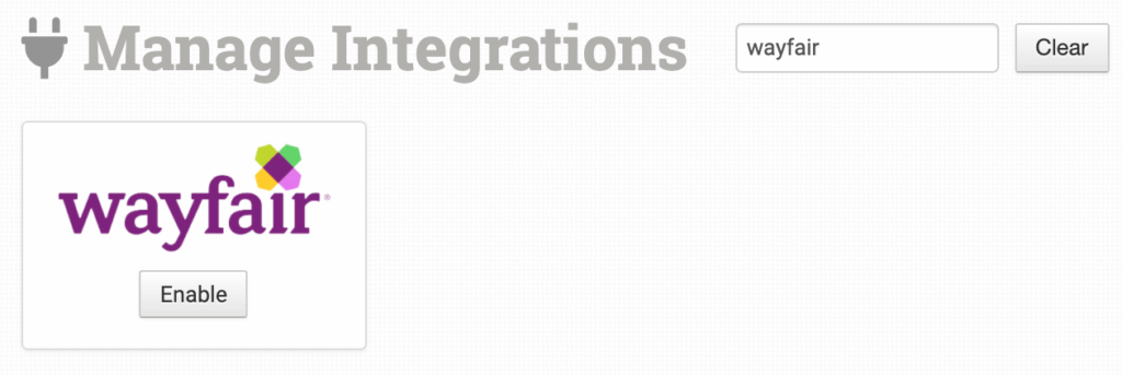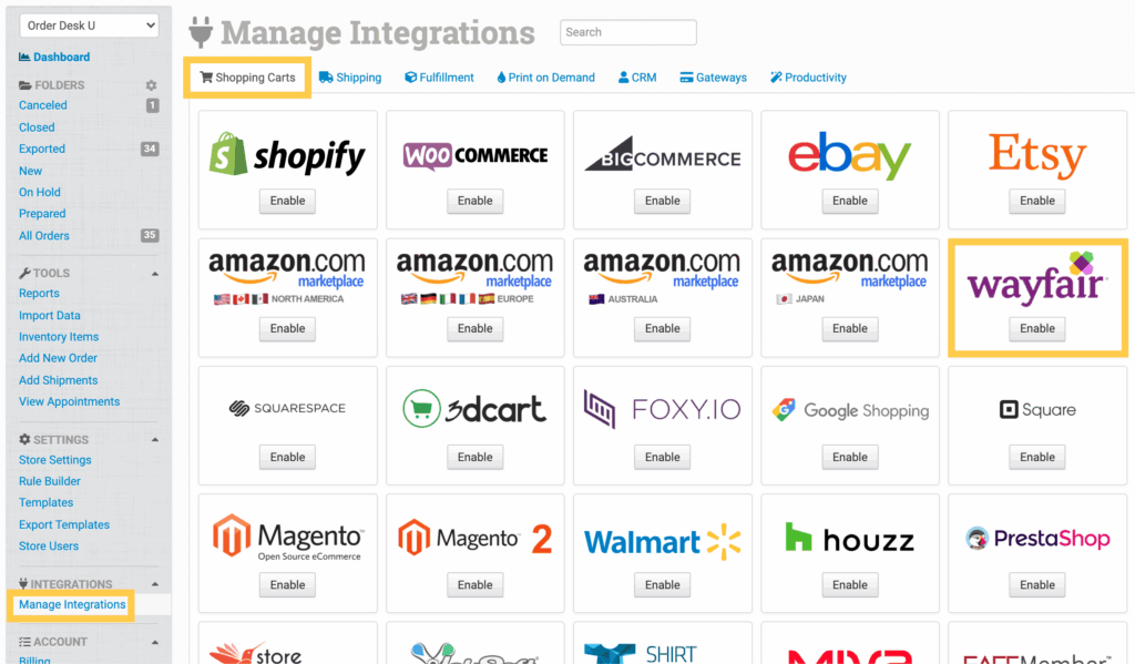 In Order Desk, click on Manage Integrations under the Integrations menu in the left sidebar. Under the Shopping Carts tab, find and enable Wayfair.