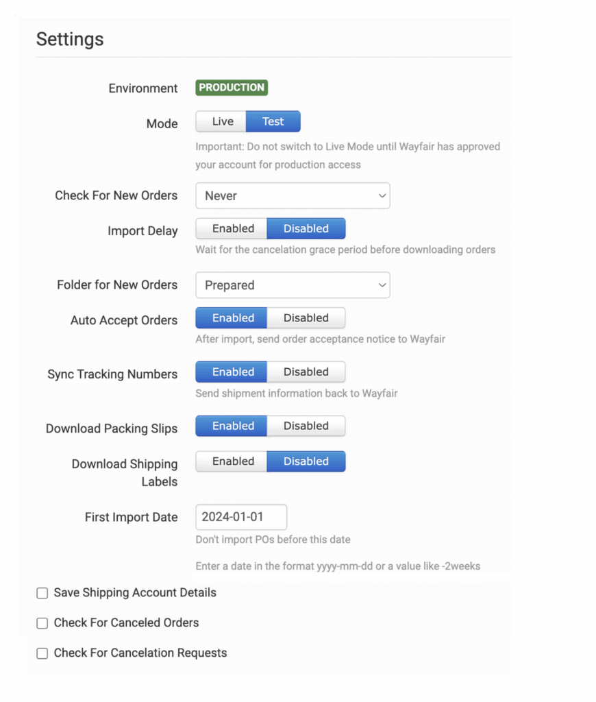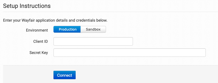 Once enabled, choose from either a Production or Sandbox environment. Be sure to choose the same application environment that is set up in your Wayfair account, as accounts used for testing can sometimes be set up in production environments. If you’re unsure, talk to your Wayfair rep.