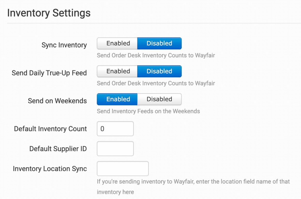 Enable if you want Order Desk to sync your inventory counts back to Wayfair. If enabled, inventory updates will be sent to Wayfair throughout the day as they happen, with up to a 7 minute delay for batching purposes.