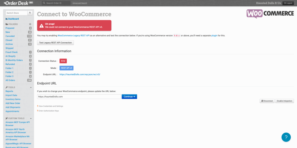 Enter your WooCommerce URL and click Continue. If you’re connected to WooCommerce’s v3 API, you’ll be shown an authorization link so your credentials can be input manually.