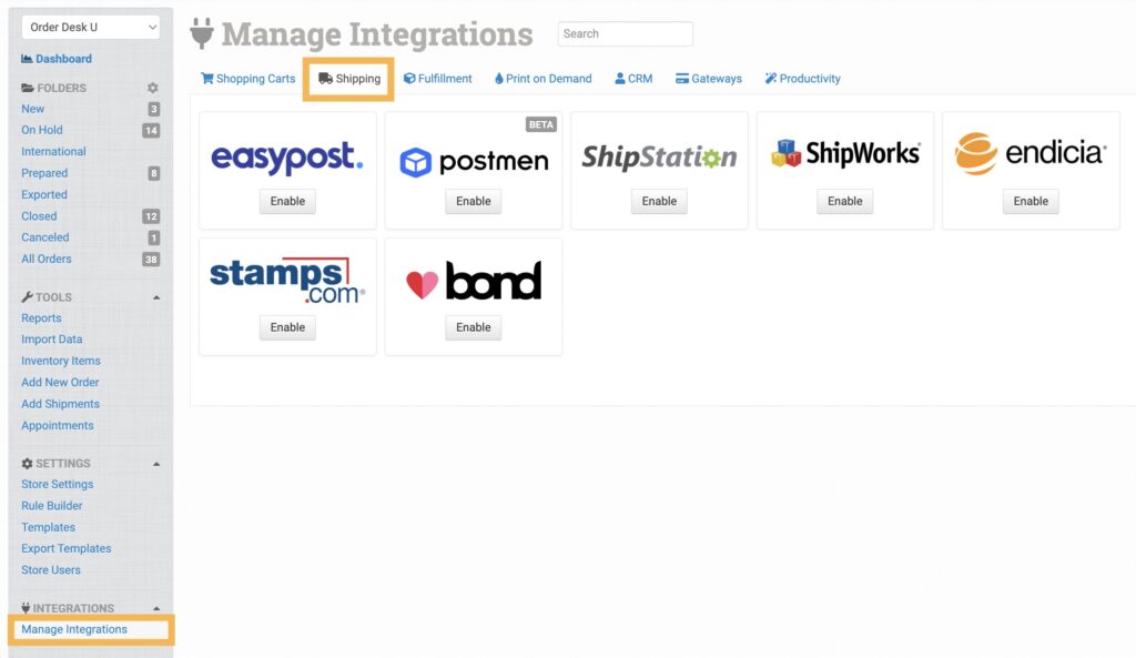 To enable the integration, click on  Manage Integrations in the left sidebar. Under the Shipping tab, find and enable the Endicia integration.