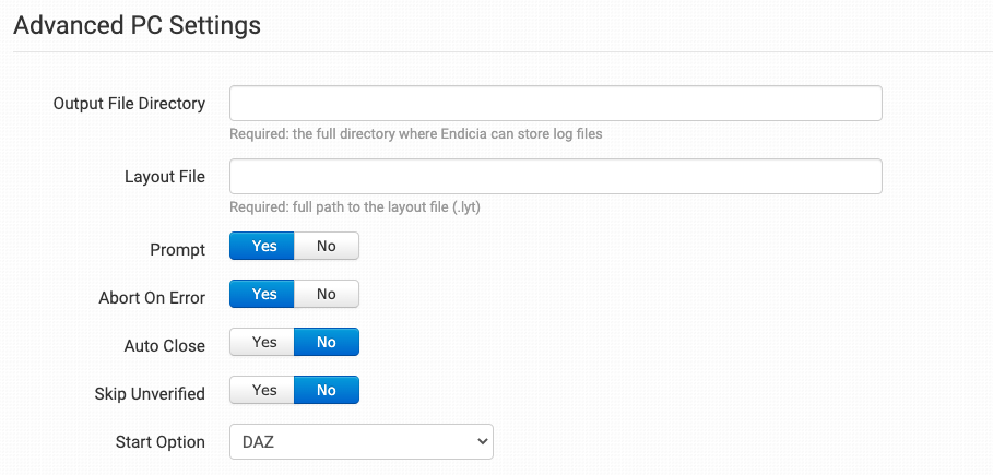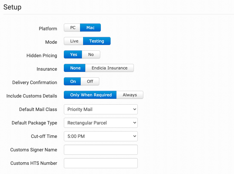 Start by selecting between PC and Mac for your Endicia integration. There are some features which only apply to the PC software (see Advanced PC Settings).