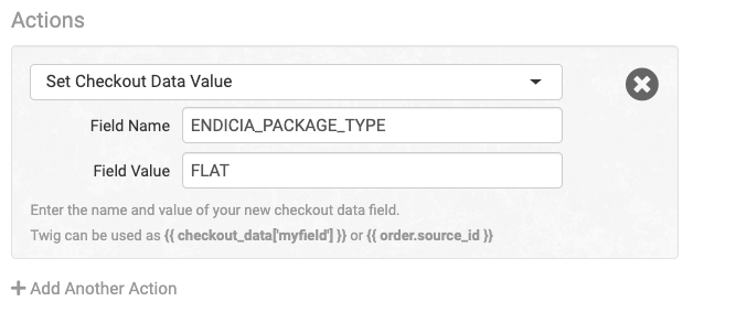 If you would like to customize the type of package based on something in your order, you can add checkout data on the order with a rule. Field name must be set with ENDICIA_PACKAGE_TYPE and one of the values in the Available Field Values table below. For example: