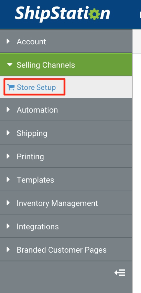 In the left sidebar, click on Selling Channels then Store Setup: