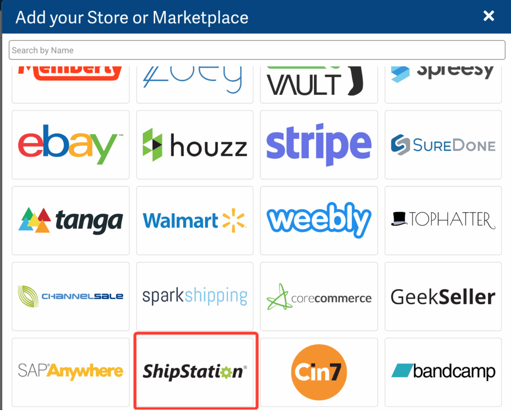 Scroll through the options and find the ShipStation button or type ShipStation into the Search by Name field and click this ShipStation button:
