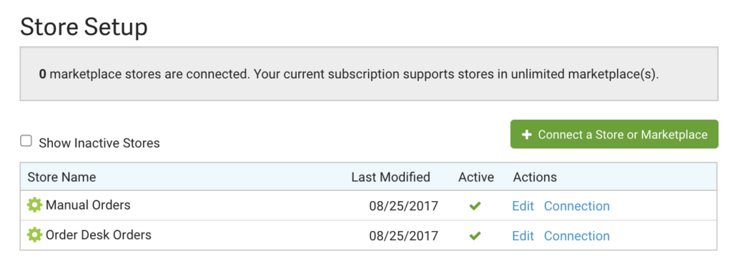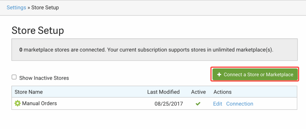 Now that the legacy integration will stop sending orders to ShipStation and ShipStation will stop pulling orders from Order Desk, you can set up a new manual store in ShipStation to connect to the new integration. While you’re still in ShipStation, click on the green Connect a Store or Marketplace button: