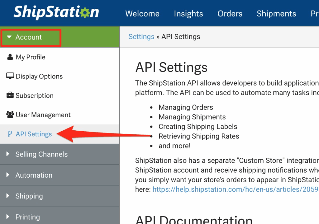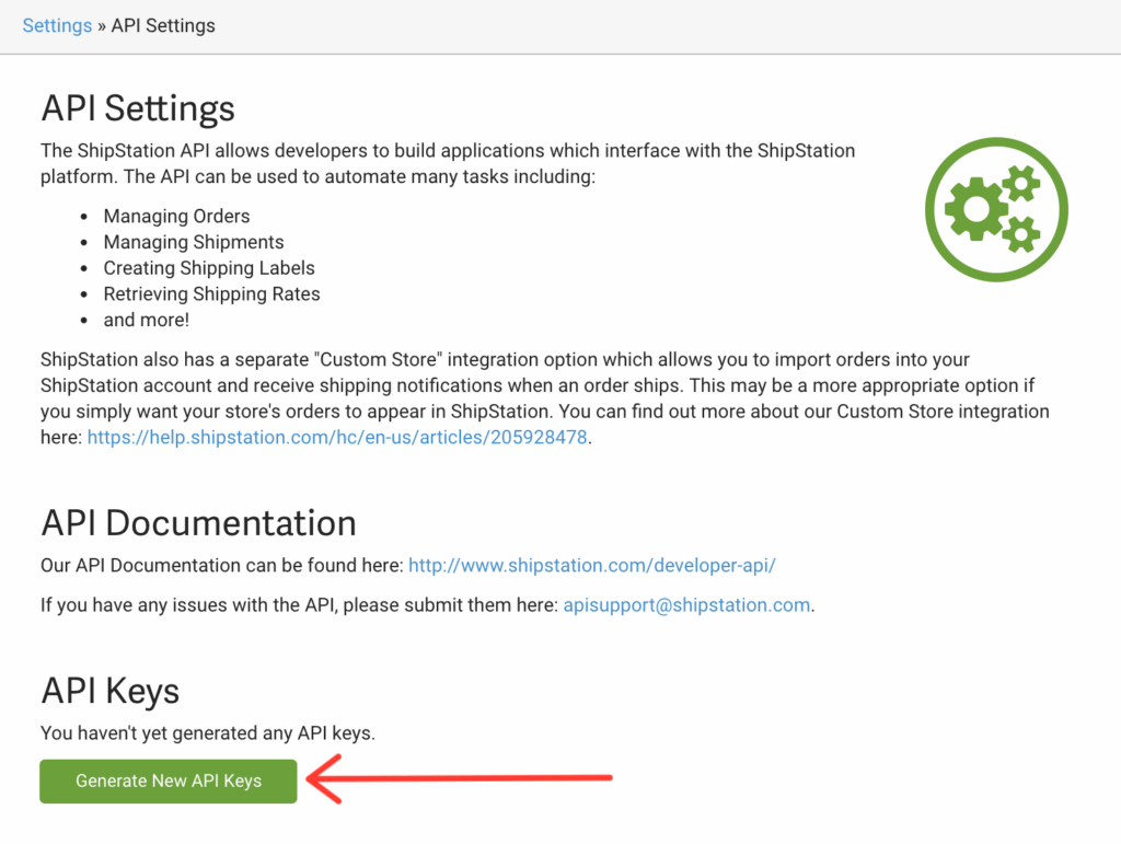 You’ll need to head back over to your ShipStation account to get your API Key and API Secret. To find these in ShipStation, click on the Gear Icon in the upper right corner, then in the left sidebar click on Account and then API Settings:
