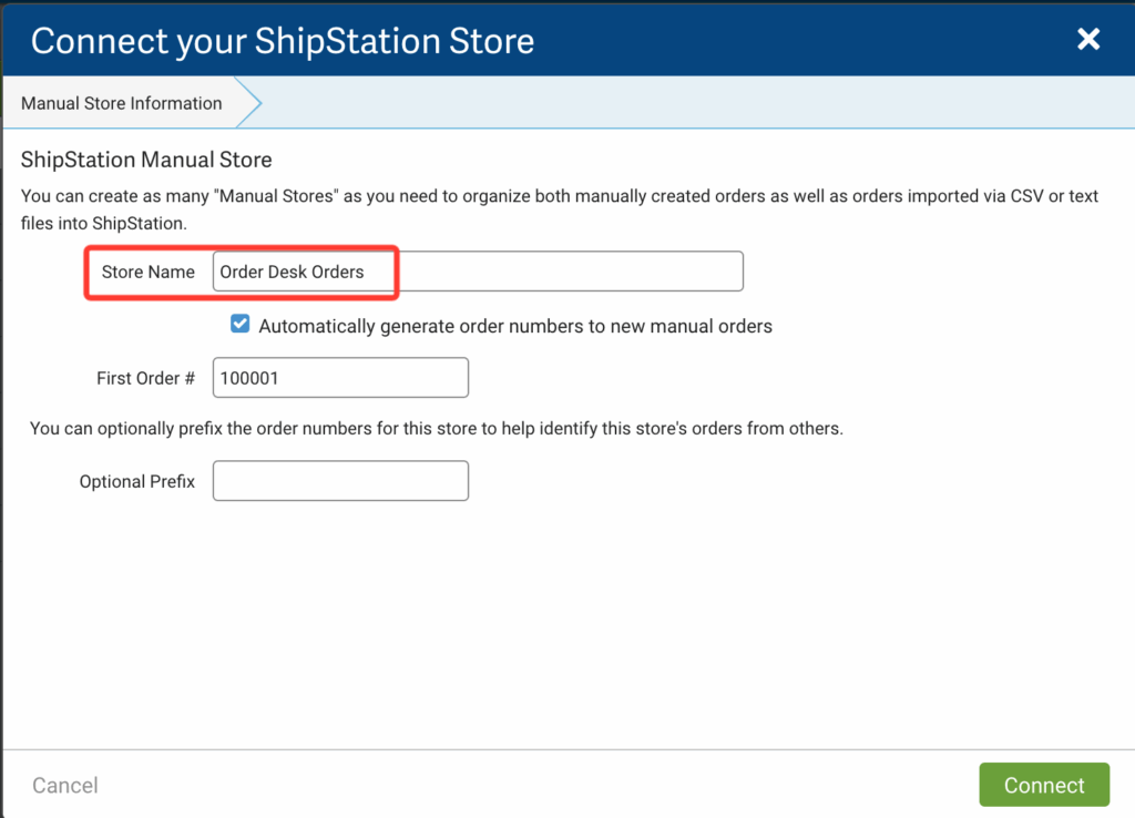 Give your new manual store a unique name so it is easily identifiable, adjust the settings and click Connect: