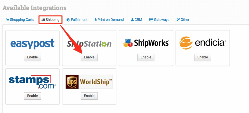 Click the Shipping tab and enable ShipStation. The ShipStation you see under the Shipping tab will be the new integration, as the legacy integration is no longer accessible from this tab: