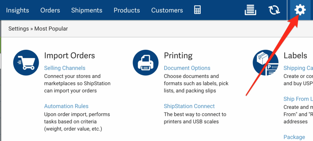 Next, you’ll need to login to your ShipStation account directly to prevent it from pulling orders from Order Desk automatically. Click on the Gear Icon in the upper right corner: