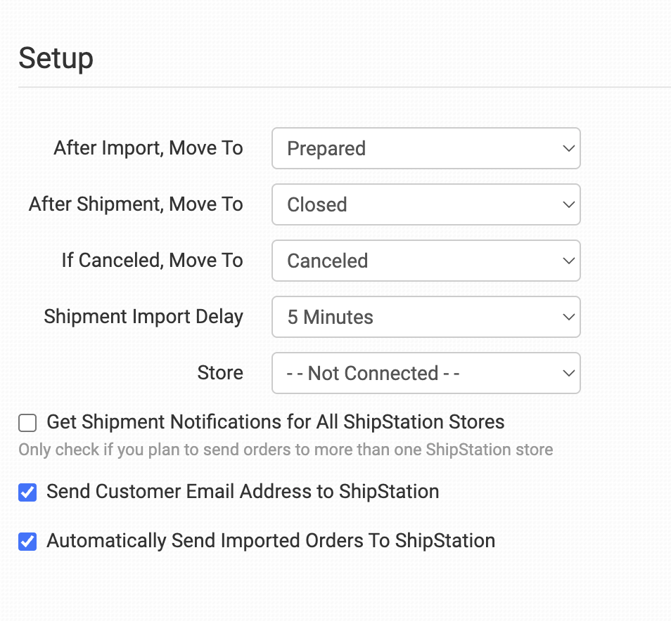 After creating a manual store in your ShipStation account following the instructions in the ShipStation setup guide, you can adjust the details about how Order Desk handles your ShipStation orders, starting with the Setup and Advanced Settings sections.