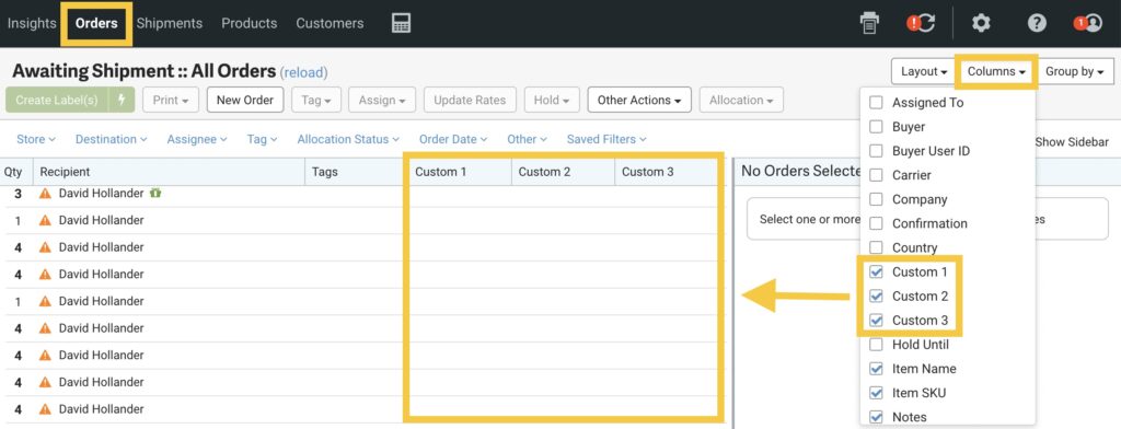 To add these columns in ShipStation, click on Orders then Columns and select Custom 1, Custom 2, and/or Custom 3 to have them show up in the order details: