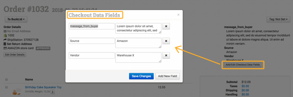 Use the checkout data field names that you want to pass through to ShipStation, such as “gift_from_buyer”, “Vendor”, “Source”, or whichever custom field name you may have on your orders.