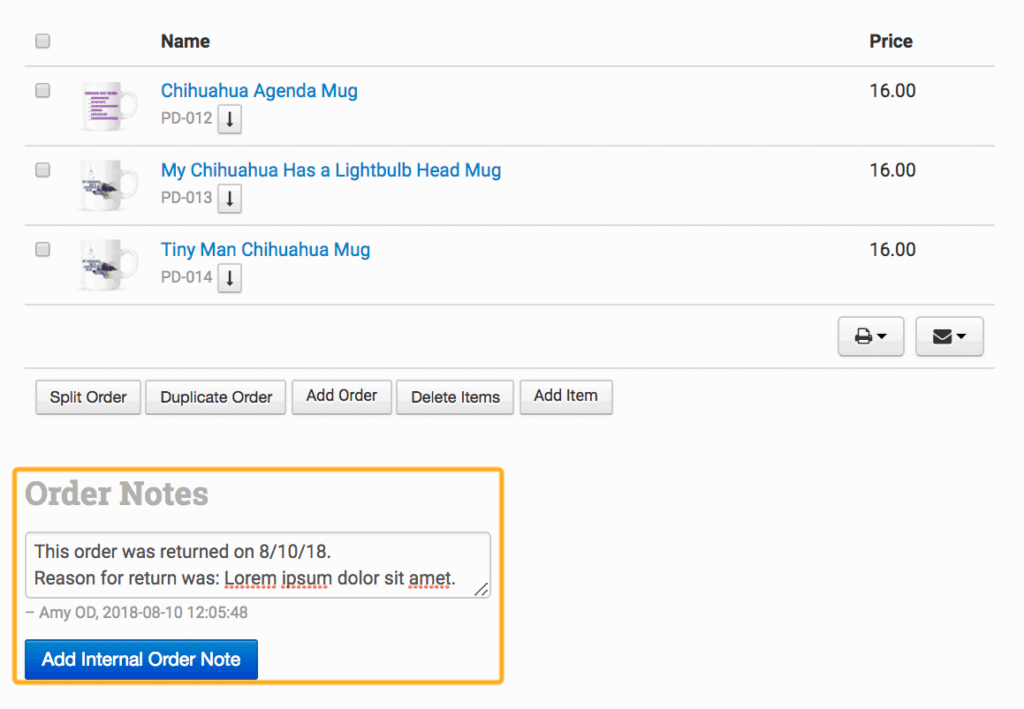 Notes can be added in the order directly. Scroll below the item information to find the notes section. When a note is added, it will include the name of the store user who wrote it as well as the date and time it was added.
