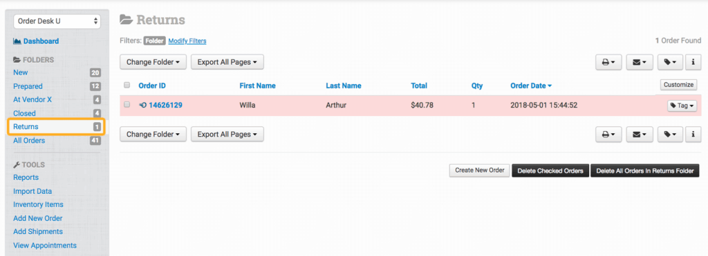 There are a number of ways to mark an order in Order Desk as being a return. This guide goes over these options in more detail, but some of the ways to mark a return are to use a specific tag color to signify returned orders, create a custom folder for returns or add order notes to provide more information about the order and its return status.